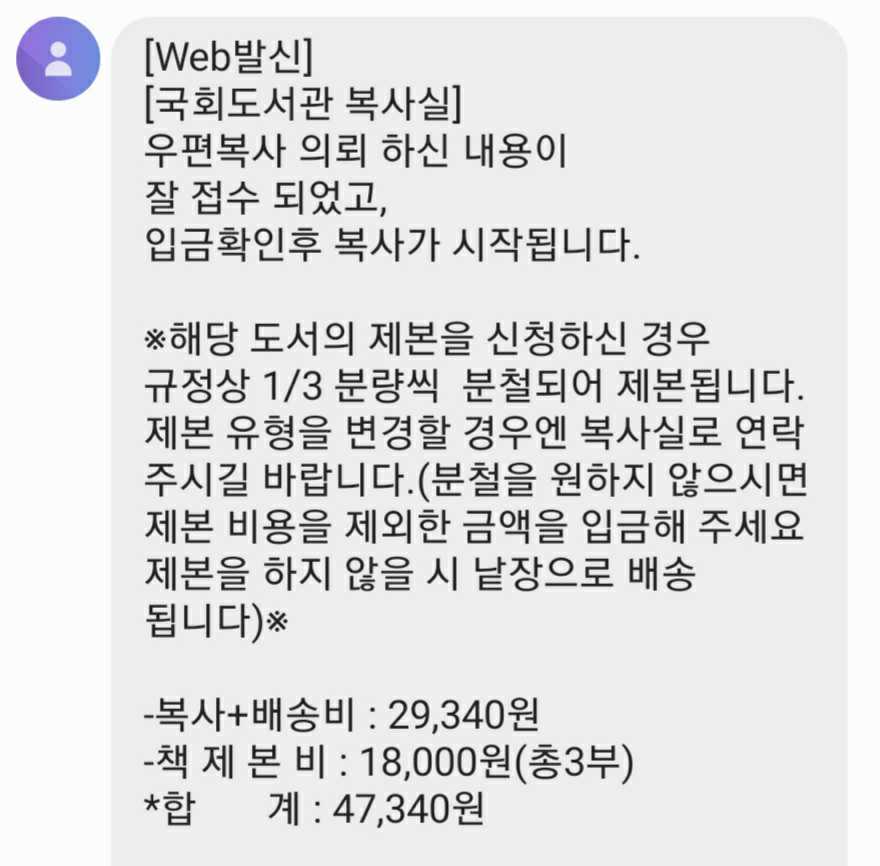 우편복사라고 하던데, 우편복사 제본 문의를 보냈고 2일정도 후에 회신이 왔습니다.