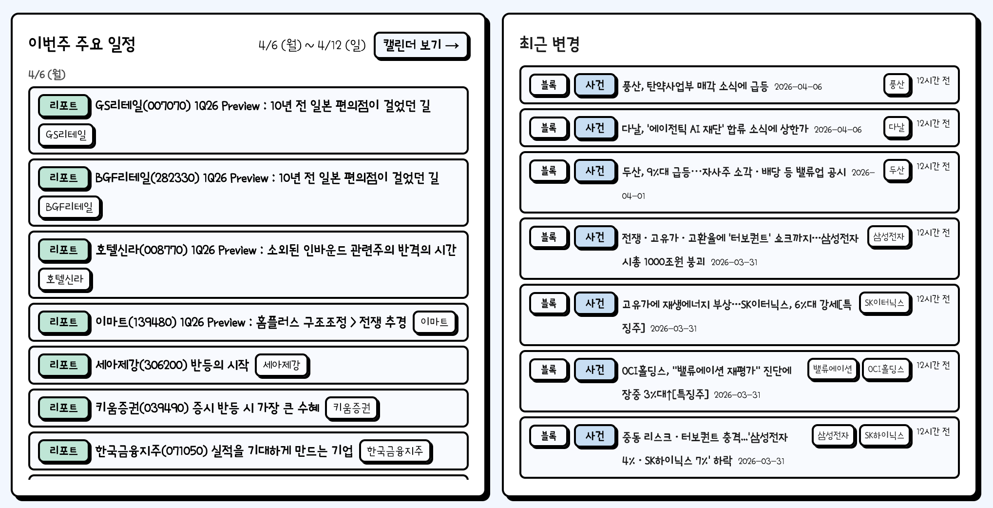 - 시장 캘린더: 실적 발표, FOMC 등 주요 일정