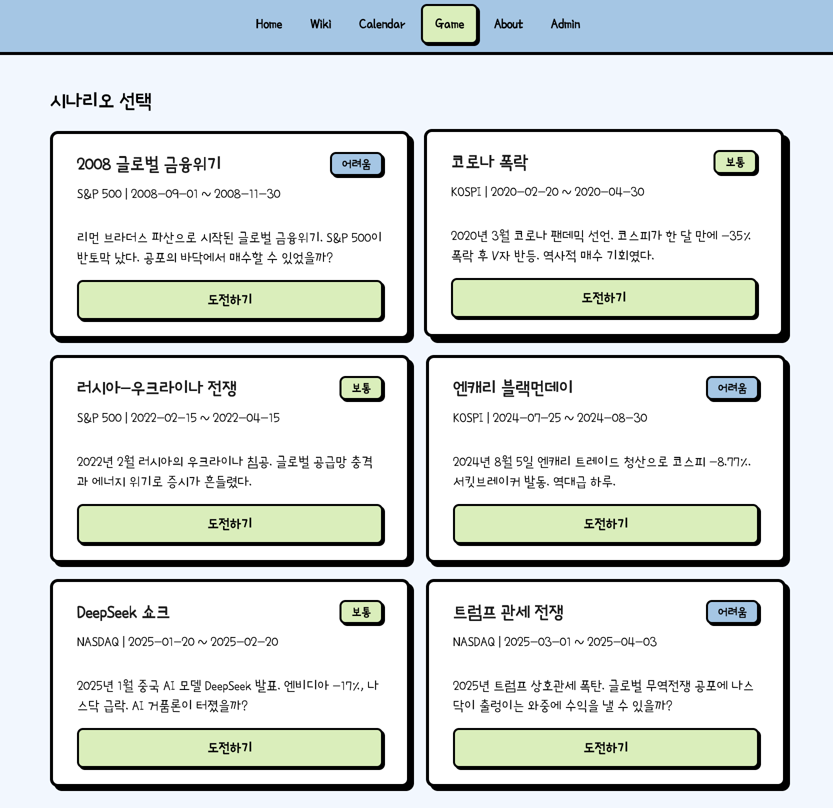 - 주요 사건 모의투자: 코로나, 금융위기 등 과거 차트·뉴스 보면서 모의투자