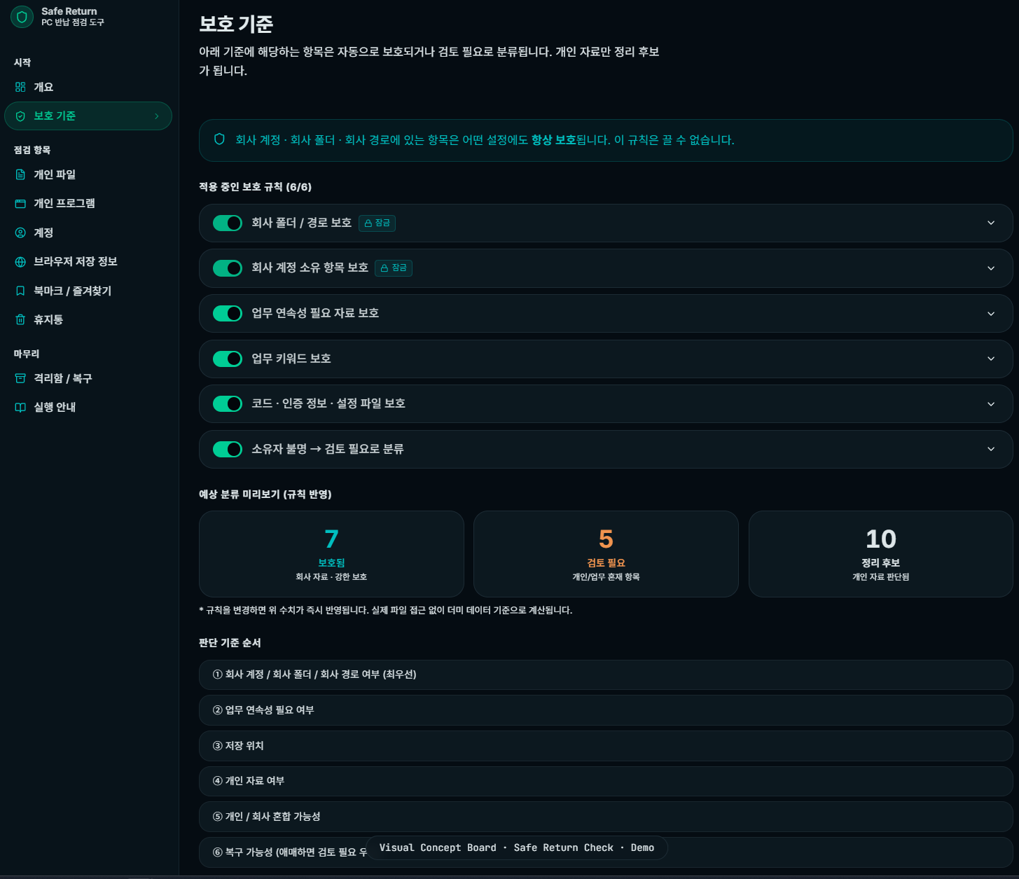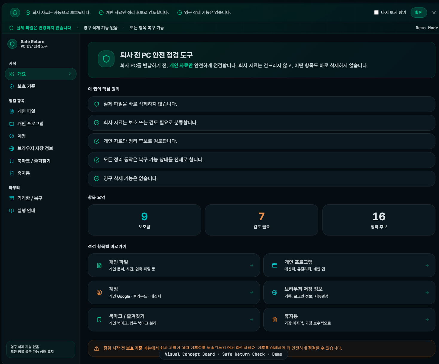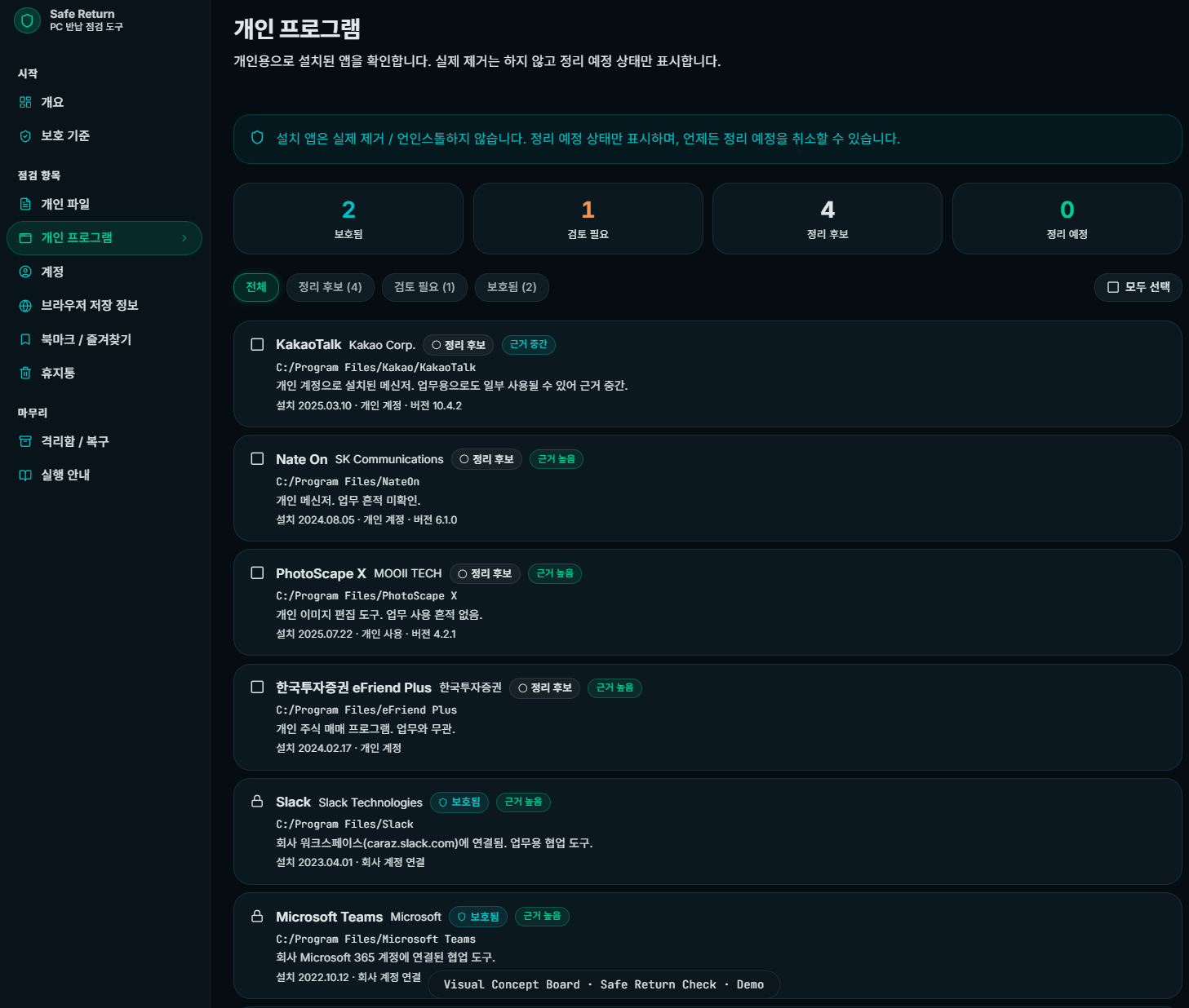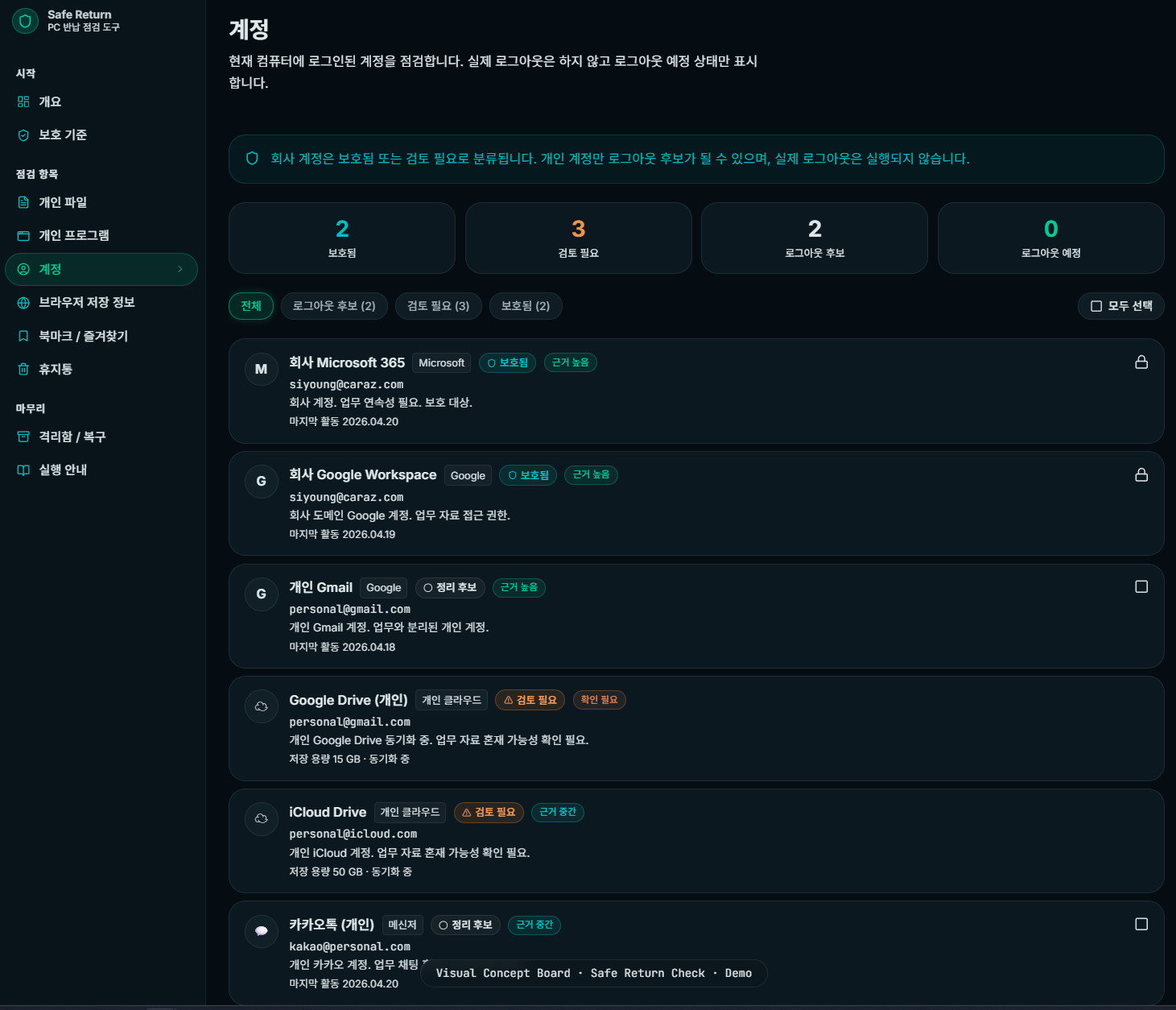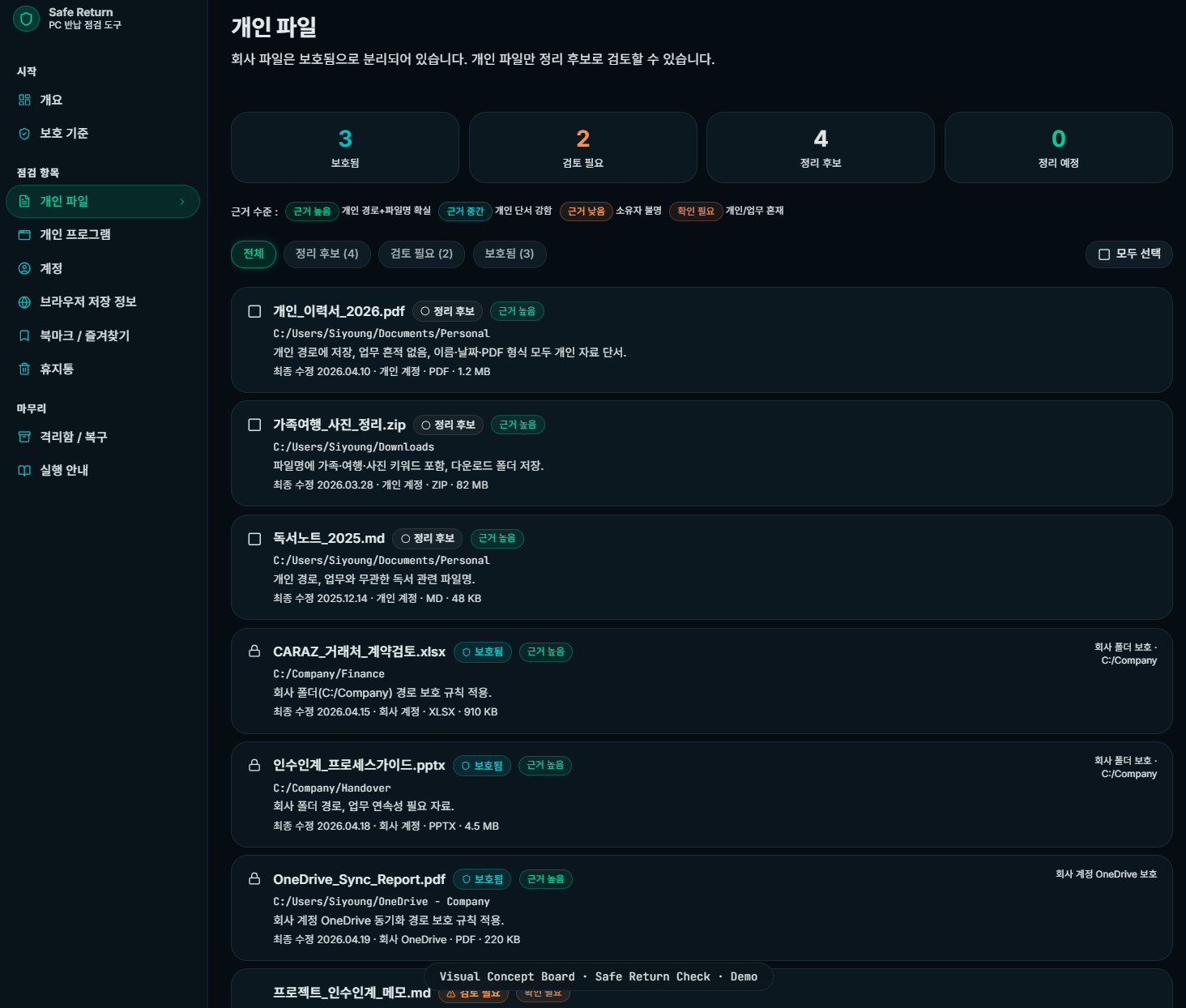 회사 자료는 보호하고 개인 자료만 정리 후보로 분류하는 보수적인 점검 도구입니다.