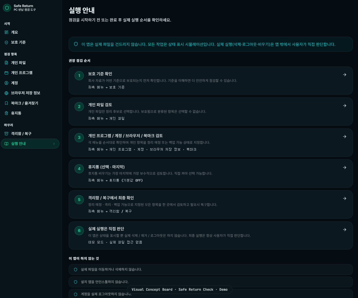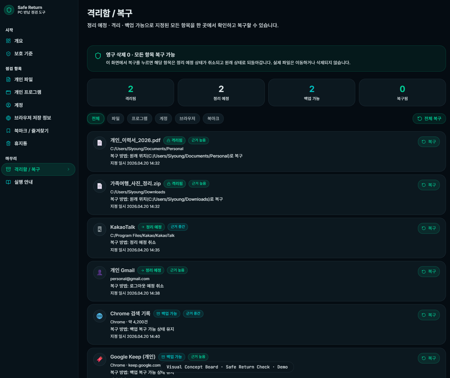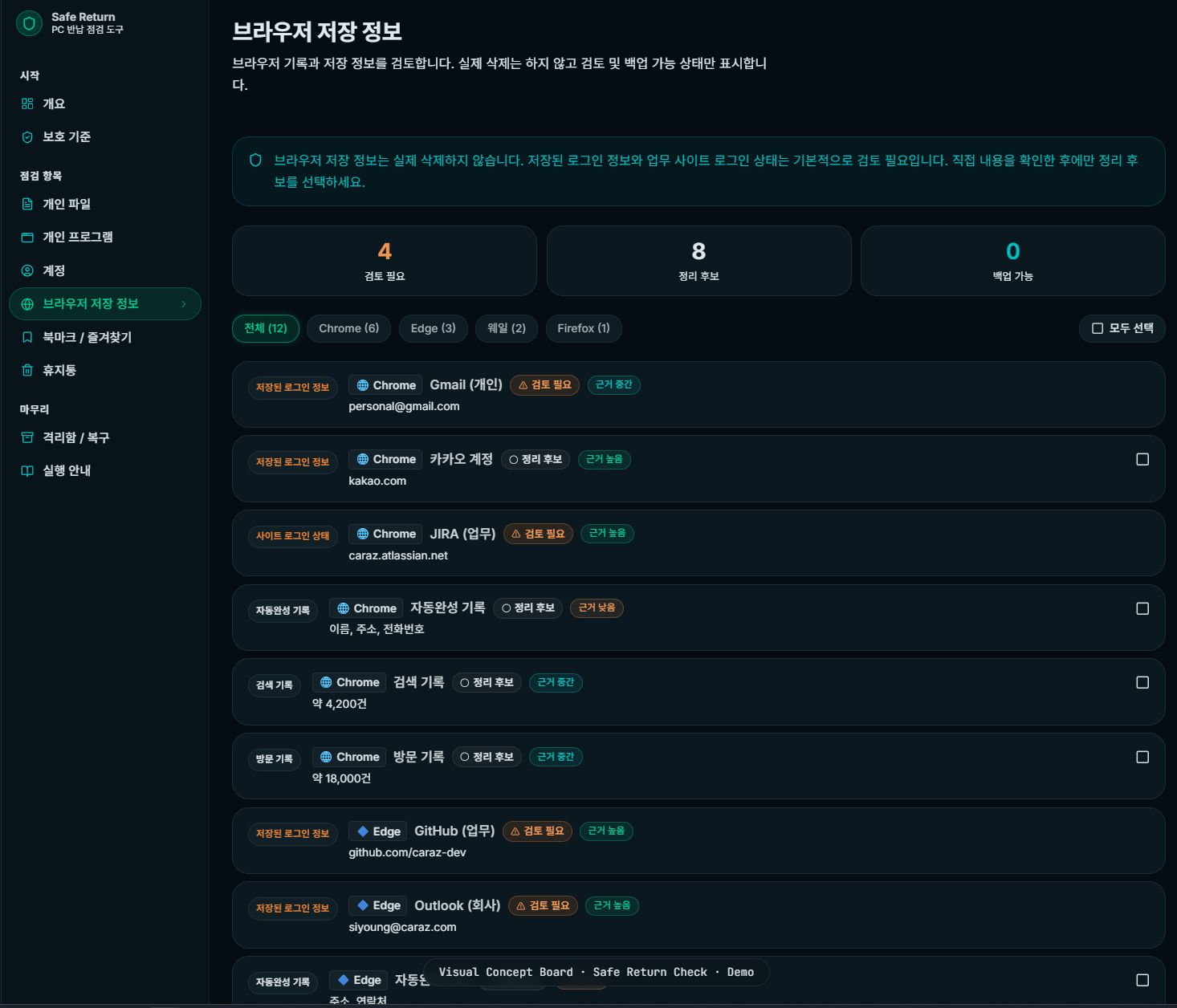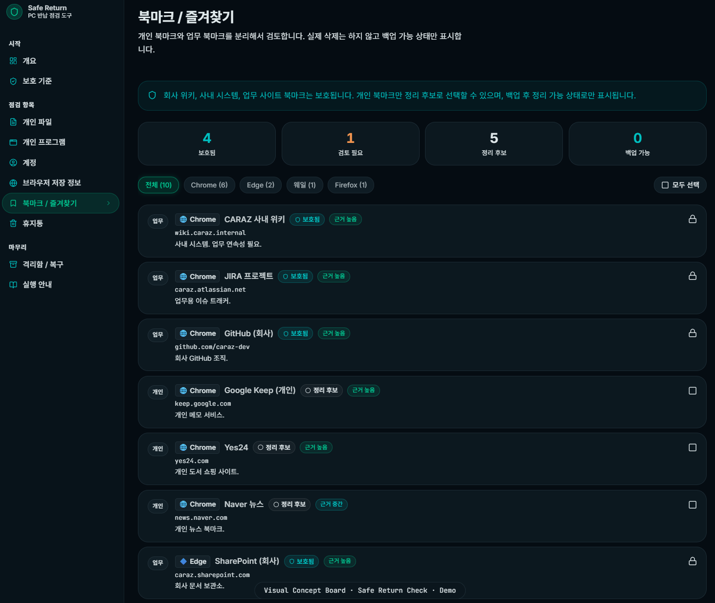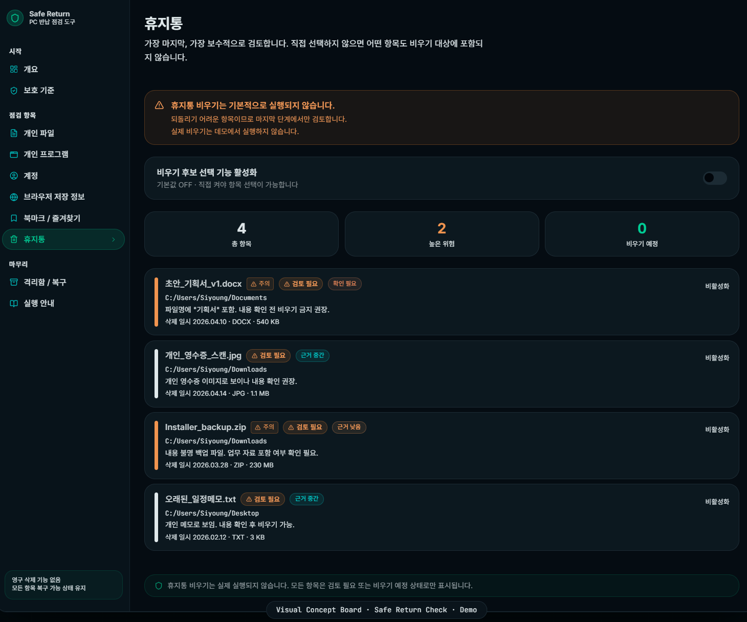 회사 자료는 보호하고 개인 자료만 정리 후보로 분류하는 보수적인 점검 도구입니다.