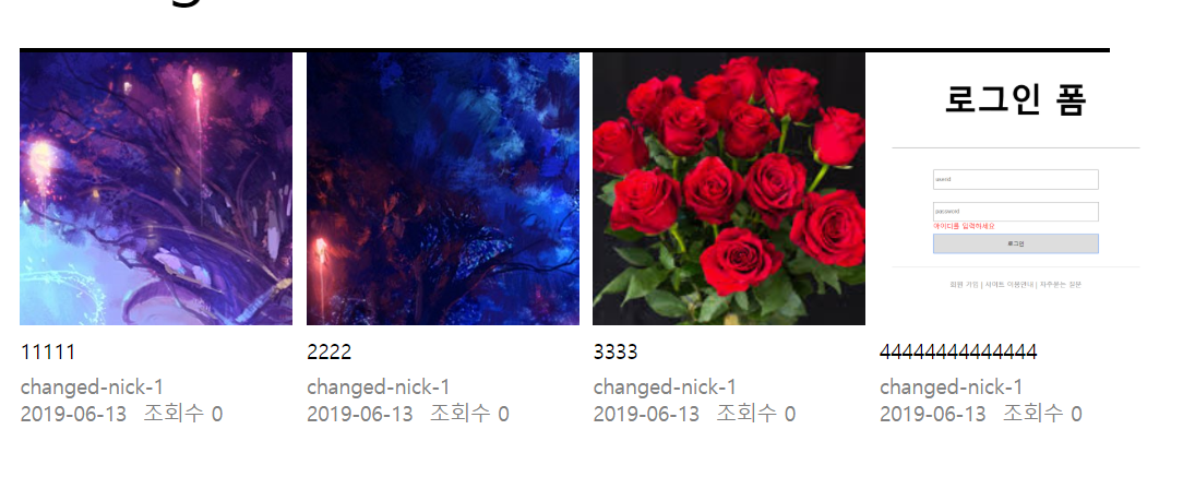 이미지, 제목, 사용자닉네임, 날짜, 조회수가 잘 출력은되네요.